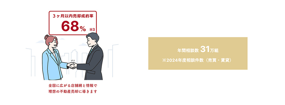 ※1 三井不動産リアルティグループは'86年度~'24年度の39年連続全国売買仲介取扱件数No.1 ※2 個人および法人向け不動産仲介を含む取扱件数 ※3 2024年度相談件数(売買・賃貸) ※4 同社でお取引いただいた方へのアンケートで三井のリハウスを奨めたいとご回答いただいた割合(2024年度) ※5 1975年の売買仲介業務開始以来の累積取扱件数(2024年度)(同社調べ/実績説明図)