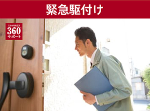 ご購入された物件で水まわり・ガス設備・給湯設備・電気設備・カギ・窓ガラスのトラブルについて、専門スタッフがご自宅へ駆付け対応(360°サポートの一例)
